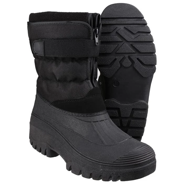 By Cotswold, these snow boots in black feature a Fleece lined insole with waterproof rubber galosh outsole, additionally they feature a gusset zip front and touch fastening strap for easy fitting. ideal for the winter months.