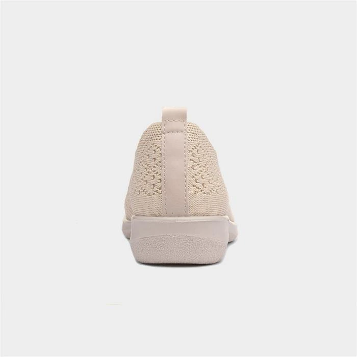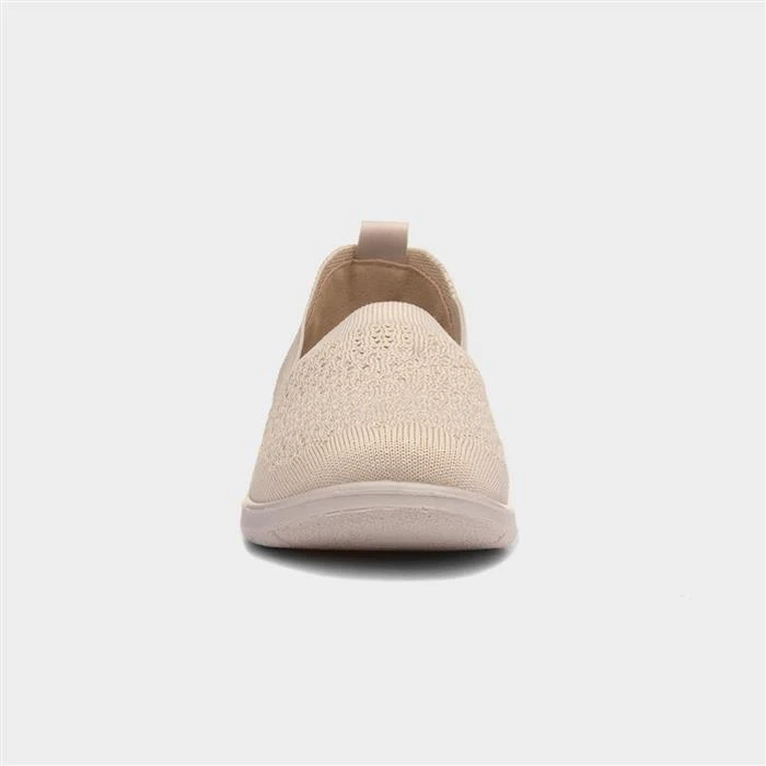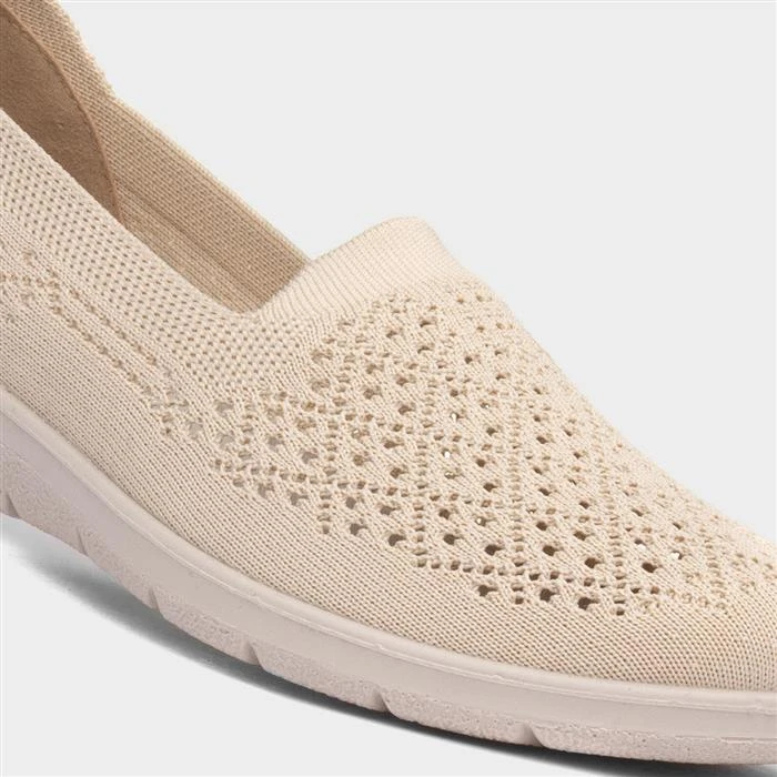 From Cushion Walk, the Leanne shoe in beige features an airy knitted upper, allowing the feet to breathe, and stretches for an easy slip on. Their cushioned insole ensures comfort and support, their low wedged heel adds height, and their outsole allows flexibility and provides a stable grip.