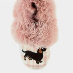 By Lazy Dogz, these Callie womens slippers in pink. This stunning slipper is perfect for all the dog lovers. It features a cute sausage dog upon a pink and cream check background and framed by the super cosy, faux fur trim. The padded insole and faux fur lining ensure your feet stay toasty warm.