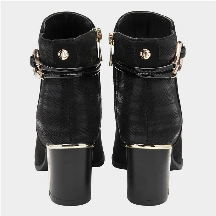 Designed by Lotus, the Autumn women’s boots in black feature a textile upper with a contrasting black panel around the ankle. They have delicate strap detailing that interlinks with metal hardware and a mirrored plate and trim on the 6.5cm block heel. These green boots are a staple silhouette but with undeniable allure!