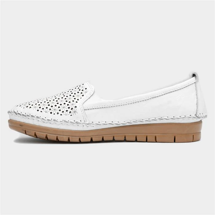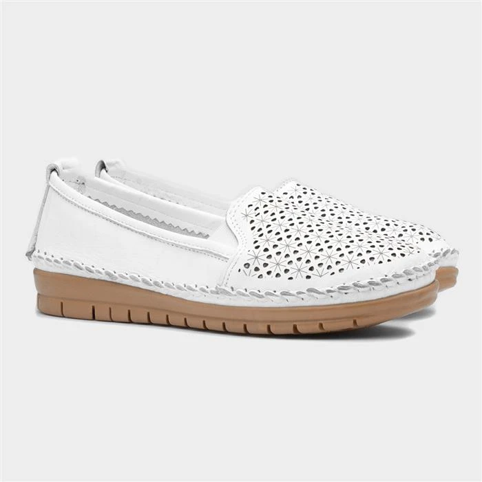 The Cypress women’s casual slip on in white, designed by Lotus, features a leather upper with laser-cut design for breathability, with elasticated gussets for an easy slip on, and includes a padded insole for comfort and support. These shoes have a great lightweight feel, giving you the ideal comfort, while their outsole is cleated for stability. These comfortable shoes also bring added height with their low wedged heel.