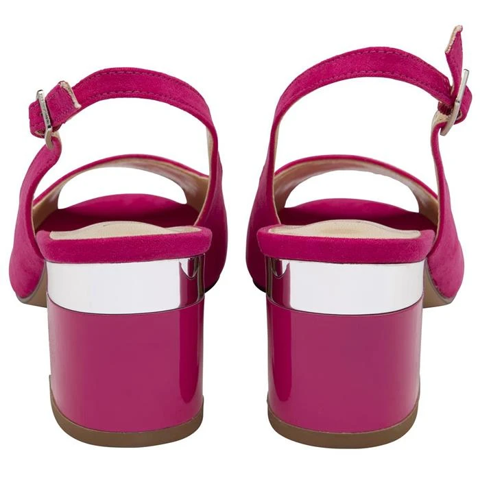 By Lotus, Evelyn womens shoes in pink. The Lotus Evelyn slingback shoe is understated, but this is what adds to its appeal as it will slip seamlessly into your hard-working wardrobe. This fuchsia peep-toe shoe sits on a contemporary 6.5cm block heel that is further pronounced by a decorative metal plate and trim insert.