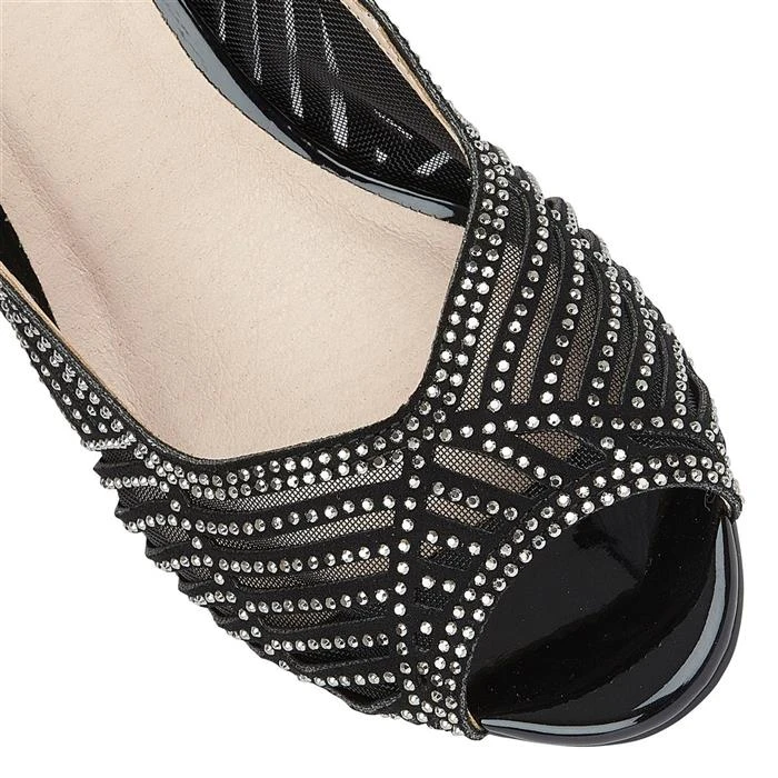These Immy women’s shoes in black by Lotus are a highly refined style and feature an open toe allowing your feet to breathe. They feature diamantes, a cut out detailing that exposes a semi-sheer mesh lining, and a scalloped edge. Their 5cm block heel offers height and stability and encompasses a mirrored plate.