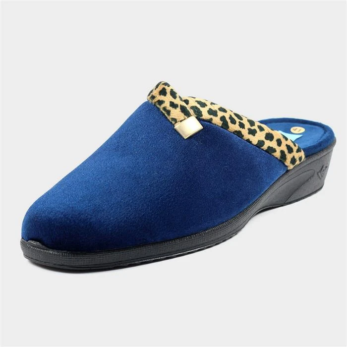 By Lunar, Michelle womens slippers in navy. The Michelle slipper is the perfect slip-on, with ocelot trims. The rubber sole provides longevity and grip while adding a little bit of height. The slippers should be placed in a pillowcase and washed at 30 degrees and allow to dry naturally. Do not tumble dry or force dry and this will misshape the slipper and damage the textile upper.