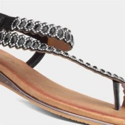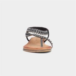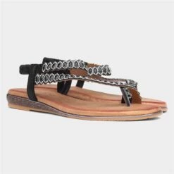 From Lunar, the Novella women’s sandal in black. It features a “glitzy” diamante upper with toe post and elasticated slingback strap for an easy slip on. Their padded insole brings comfort, while their low wedged heel brings height. Additionally, they feature a gripped outsole for stability.