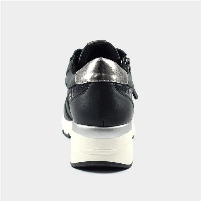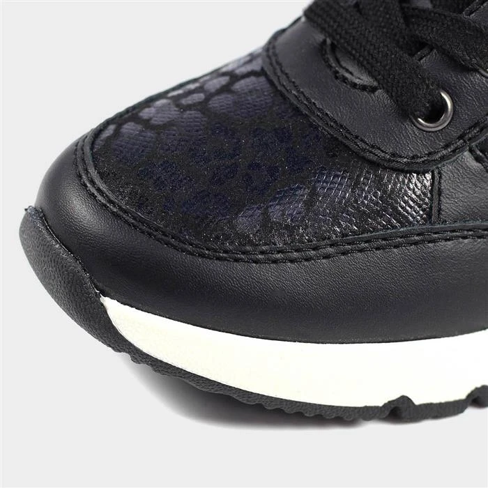 By Lunar, Saffron women’s casual trainer shoes in black. The Saffron, a fabulous, wedged trainer. Once you try these, you’ll not want to take them off. The wedge, along with the padded insole will leave you feeling like you are walking on clouds. They feature metallic inserts to the heel and tongue and snake print insets to the upper and sides, these are sure to be at the top of your go to shoe list.