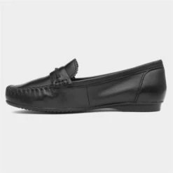 This women’s loafer from Marco Tozzi features a black leather upper with traditional loafer stitching, penny strap detailing, and a jagged design on the tongue. A gripped outsole ensures stability throughout the day. They’re comfortable, lightweight, and great for finishing a smart look at work or school!