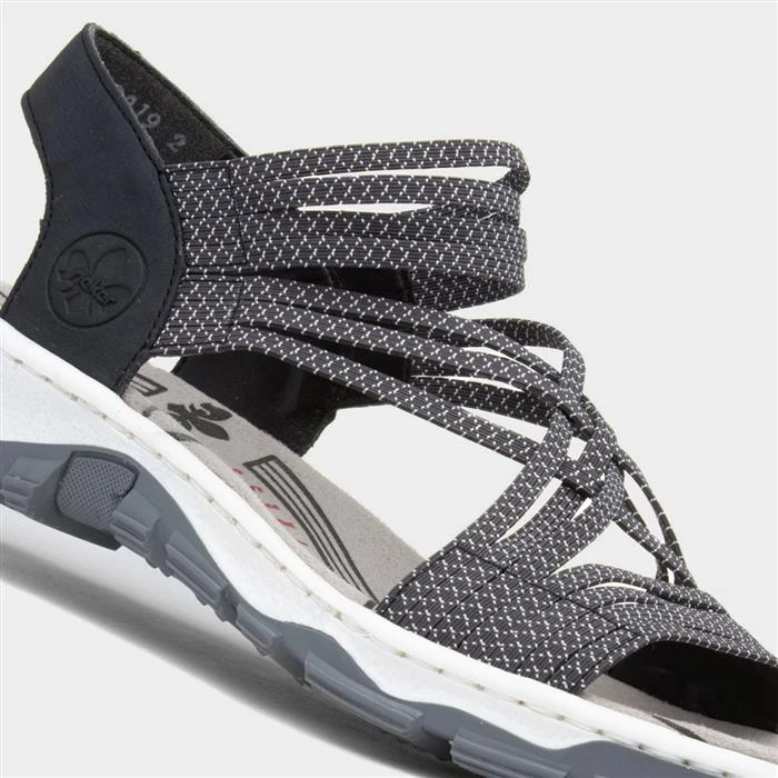 These women’s sandals from Rieker feature a black strappy upper with white stitch detailing that stretches for an easy slip on and comfortable fit. Their AntiStress insole offers comfort, support, and a lightweight feel, and their cleated outsole ensures stability and durability.