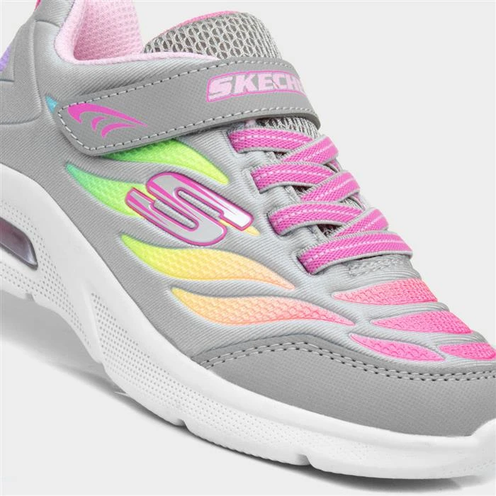 These Microspec Max girls trainers from Skechers feature a grey upper with multicoloured, gradient detailing and Skechers branding. Their bungee laces ensure a quick and easy fitting while their easy fastening strap ensures a secure fit. Their bubbled outsole provides comfort and stable grip. These are great from playtime or for P.E.