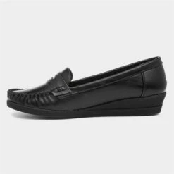 A failsafe way to complete any casual look. These womens black moccasin style casual shoes feature a round whip stitched toe, low wedge and a grip sole. They are perfect for creating a look that is smart yet casual. Style these with any type of trousers, formal dress or even skirts, they are simply versatile.