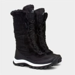 Designed by Trespass, these womenâs snow boots embrace a black upper with faux fur lining to keep out the cold. They feature a lace up fastening for an adjustable fit, while their waterproof and breathable membrane keeps your feet dry.