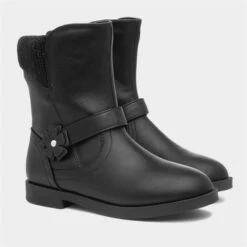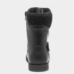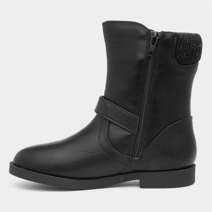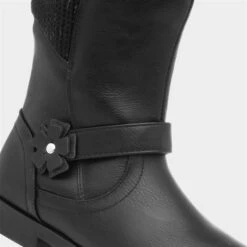 Adorn her little feet in a pair of these girls flat boots. In versatile black, these boots showcase a round toe front as well as a padded insole ensuring her feet are comfortable. An ankle strap finished with a floral embellishment finish these boots nicely, whilst their knitted collar keep her cosy.